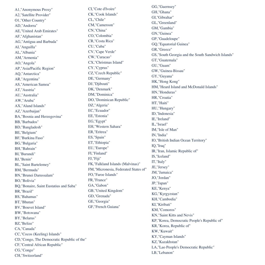 #cat /etc/httpd/conf.d/geoip.conf <IfModulemod_geoip.c> GeoIPEnable On GeoIPDBFile/usr/share/GeoIP/GeoIP.dat <Directory /> SetEnvIf GEOIP_COUNTRY_CODE AN BlockCountry SetEnvIf GEOIP_COUNTRY_CODE BL BlockCountry # add any number of countries here based on your requirement # you can refer to the country codes in GeoIP website. Deny from env=BlockCountry </Directory> </IfModule> #